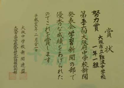 新聞を手にする生徒を見慣れた今日この頃、1年生が第56回 大阪府中学校新聞発表会『学習新聞の部』で、努力賞を受賞しました!