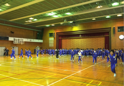 ※写真は、講話の様子と身体を動かすトレーニングに取り組む生徒たちの様子