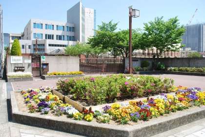 難波中学校の校門には季節ごとには色んな花が植えられています。