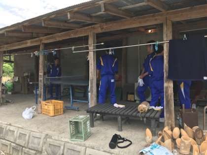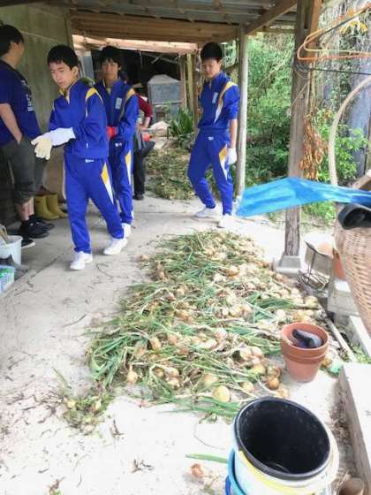 玉ねぎの収穫をしたのち軒下にある卓球台で卓球大会