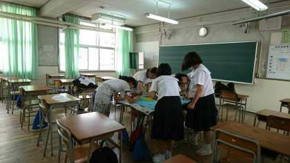 放課後の教室をのぞくと、有志の人が集まって体育大会の学級旗に色をぬっていました。