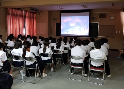本日6限、1年生 平和学習の取り組みが行われ視聴覚室にて大阪大空襲のビデオを観ました。