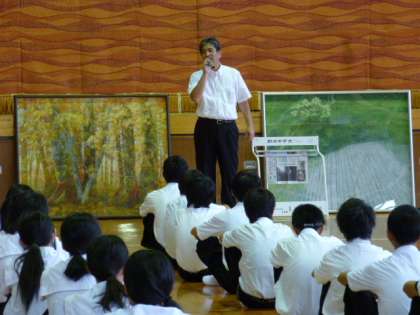 今日は、難波中学校の大先輩からの絵画の寄付の紹介がありました。