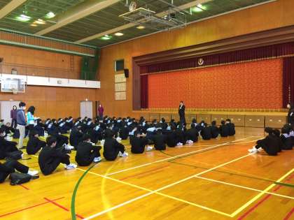 3年生が卒業し、本日の全校集会は1・2年生だけで行われ、広い体育館が一層広く感じられました。