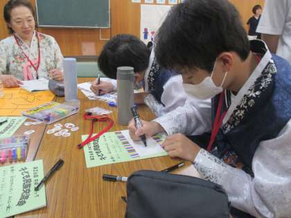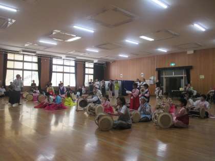 ソンセンニムの楽器演奏から始まり、パランチプソンニムという遊びで交流をして盛り上がりました。イルムを制作したり、ウリナラの楽器について学んだあと、各学年に分かれて練習をしました。
