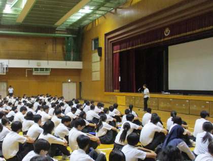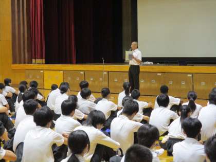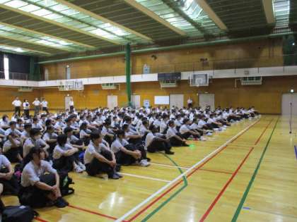 引き続き、校長・人権教育担当・生徒指導担当からの講話を行い始業式を終え、3年生は明日の万博見学の前日指導、1・2年生は教室で学級活動を行いました。