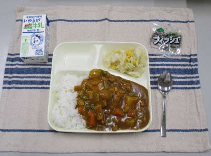 本日の献立は、チキンカレーライス・牛乳・キャベツとコーンのサラダ・ミニフィッシュです。