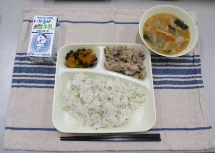 本日の献立は、菜飯・牛乳・豚肉の甘辛焼き・みそ汁・かぼちゃのいとこ煮です。