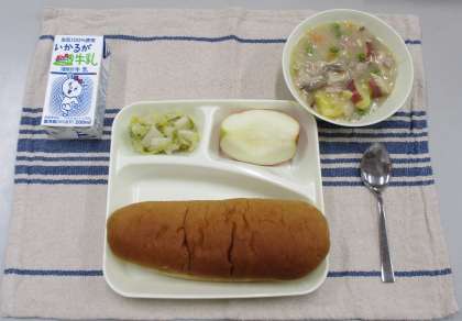 今日の献立は、黒糖パン・牛乳・鶏肉とさつまいものシチュー・はくさいのピクルス・りんごです。