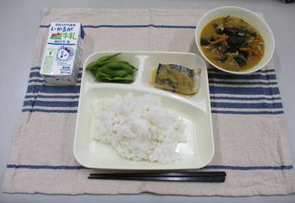 今日の献立は、ごはん・牛乳・さごしのみぞれかけ・かぼちゃのみそ汁・えだまめです。