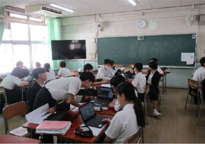 新しい学習者用端末を使い、グループで話し合いながら紹介する内容を検討します。