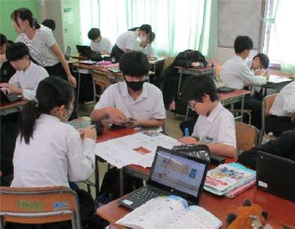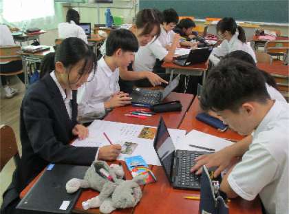 学習者用端末を活用し、調べ学習や写真の検索などを行い、それぞれの担当で記事を仕上げます。