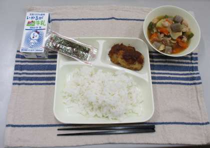 今日の献立は、ごはん・牛乳・みそカツ・じゃがいもと野菜の煮もの・焼きのりです。
