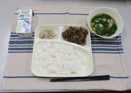 今日の献立は、ごはん・牛乳・プルコギ・トック・もやしのナムルです。
