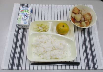 今日の献立は、ごはん・牛乳・関東煮・はくさいの甘酢あえ・みかんです。