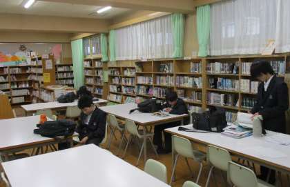 放課後の図書室です。 本を読んだり、自習をしたり、思い思いに自分の時間を過ごしています。