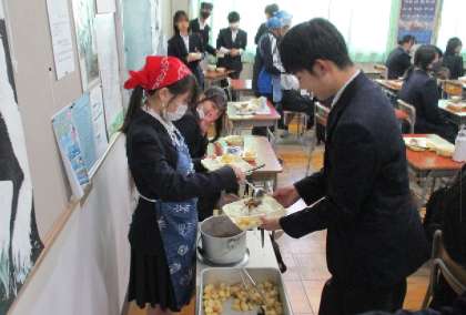 期末テストが終わり緊張がほどけたのでしょうか、教室にホッとした空気が流れます。感染対策で給食の前に手洗い・うがいなども行い、配膳をしています。