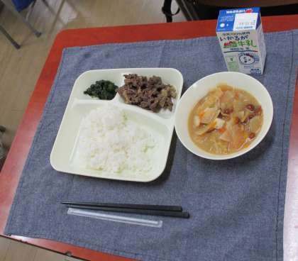今日の献立は、ごはん・牛乳・牛肉の甘辛焼き・なめこのみそ汁・ほうれんそうのおひたしです。