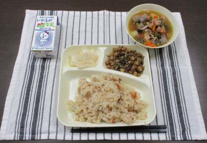 今日の献立は、かやくご飯・牛乳・鶏肉と野菜の煮もの・じゃこ豆・かぶのゆず風味でした。