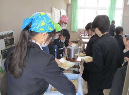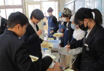 かやくご飯は大人気、みてるだけで美味しそうです。配膳作業も心なしか楽しそうです。