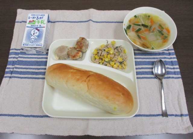今日の献立は、おさつパン・牛乳・焼きシューマイ・中華スープ・ツナとチンゲンサイのいためものです。