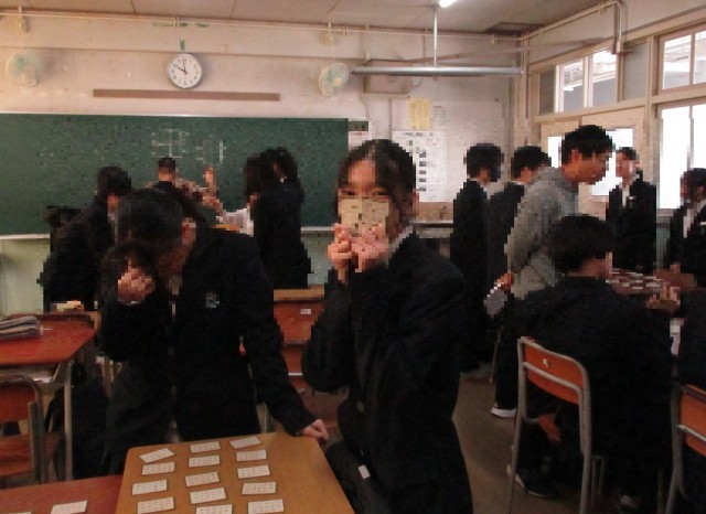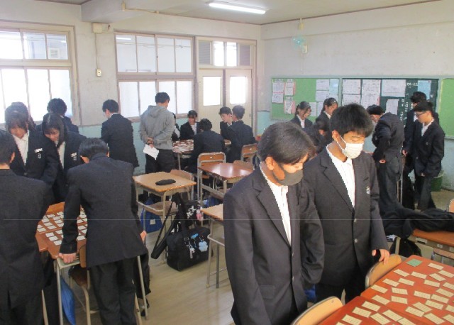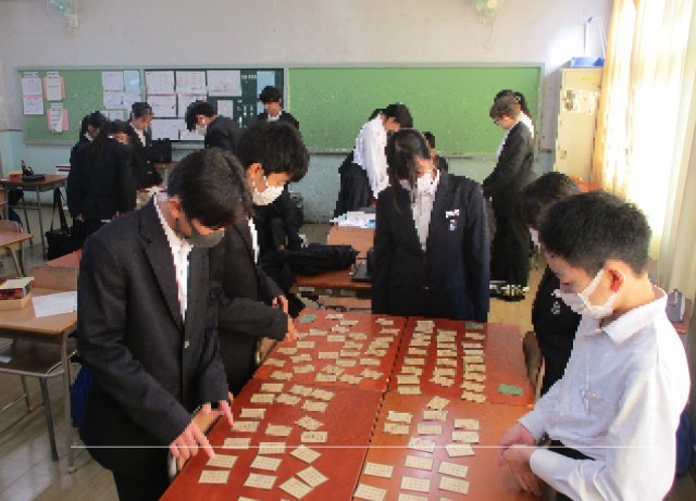 上の句が詠まれたら、すぐに札をとる生徒もいます。