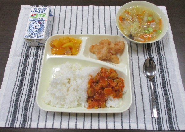 今日の献立は、ごはn・牛乳・ケチャップライス(具)・スープ・れんこんフライ・黄桃(カット缶)です。