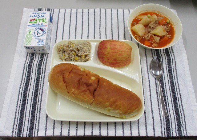 今日の献立は、おさつパン・牛乳・ケチャップ煮・ささみと野菜のソテー・りんごです。