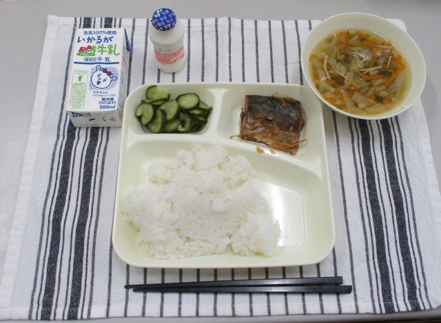 今日の献立は、ごはん・牛乳・さばのみそ煮・五目汁・きゅうりの甘酢づけ・発酵乳です。