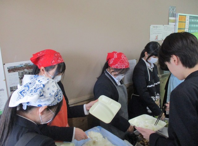 給食の配膳も協力して行っています。しっかり並んで自分のトレイをもらいます。