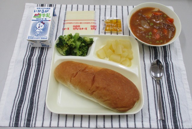 今日の献立は、コッペパン・牛乳・ビーフシチュー・ブロッコリーのサラダ・スライスチーズ・みかんジャム・洋なし(カット缶)です。
