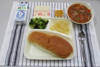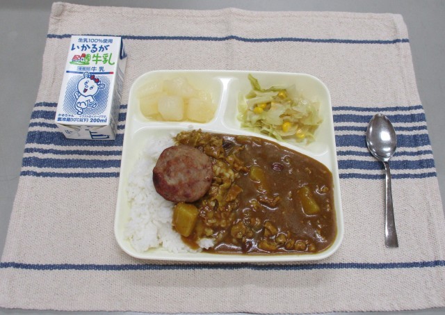 今日の献立は、豚肉と金時豆のカレーライス・牛乳・焼きミニハンバーグ・サワーソテー・和なしです。