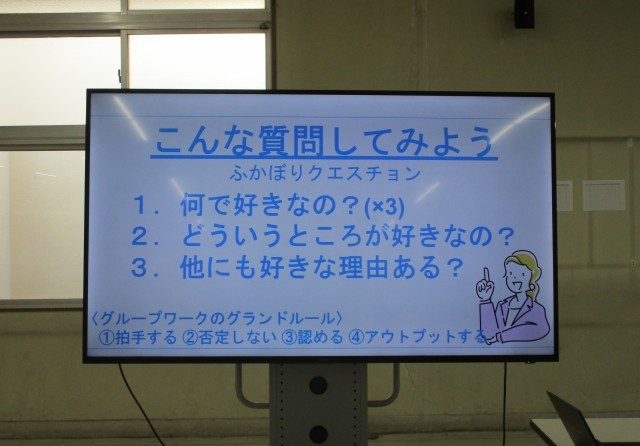 自分の「好き」なことから関連するイメージを膨らませ、グループ内で「好きなこと」をお互いに肯定的に肯定的にインタビューします。褒めて深掘りすることで、自分自身が見えてきます。