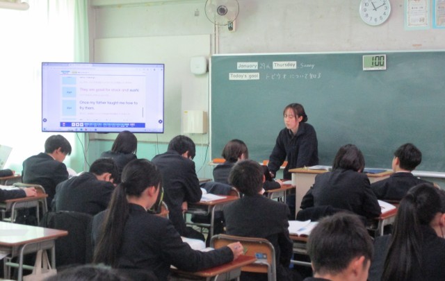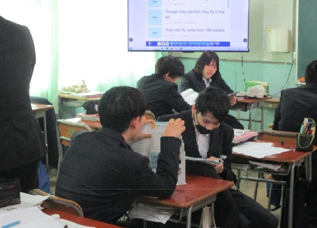 教科書本文を音読し各自で練習した後、ペアワークを行い、お互いに読み合わせします。