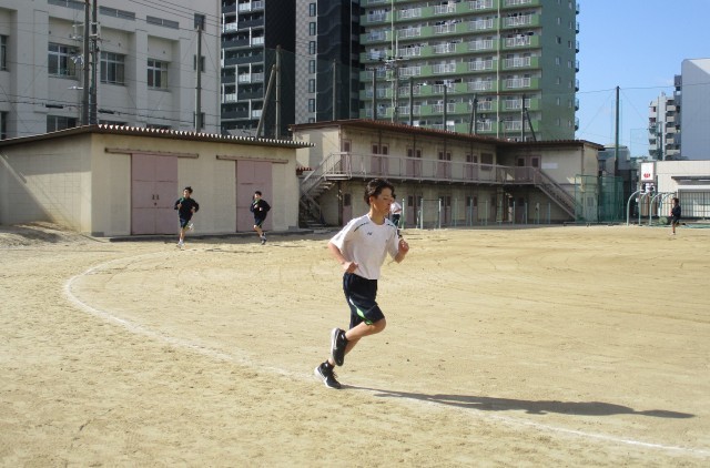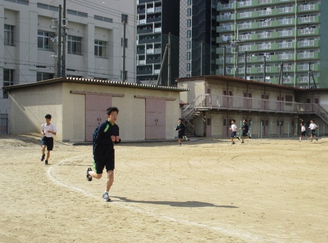 持久走は1500mのタイム計測です。走り始めは苦しくなる場面がありますが、ペースを守って走っていると体が慣れてきます。持久走は、心肺機能も高まりやり遂げる心も強くなります。
