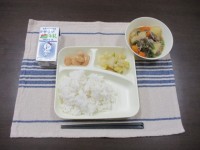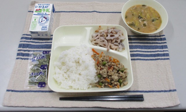 今日の献立は、ごはん・牛乳・鶏ごぼうご飯(具)・きざみのり・みそ汁・焼きれんこんです。