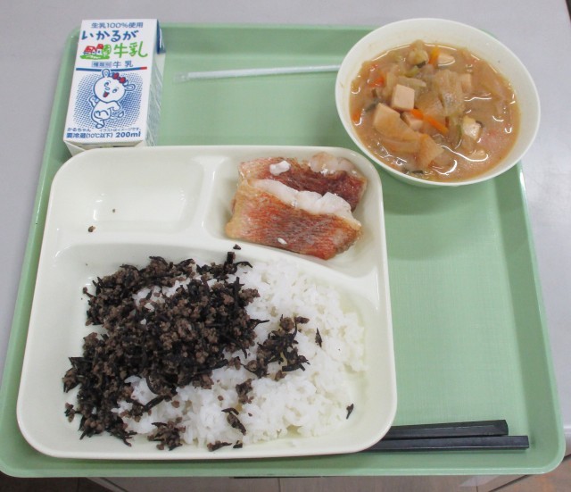 今日のメニューは、ごはん・牛乳・あかうおのレモンじょうゆかけ・みそ汁・牛ひじきそぼろです。