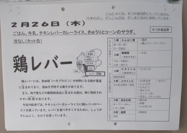 今日の献立は、チキンレバーカレーライス・牛乳・きゅうりとコーンのサラダ・洋なし(カット缶)です。