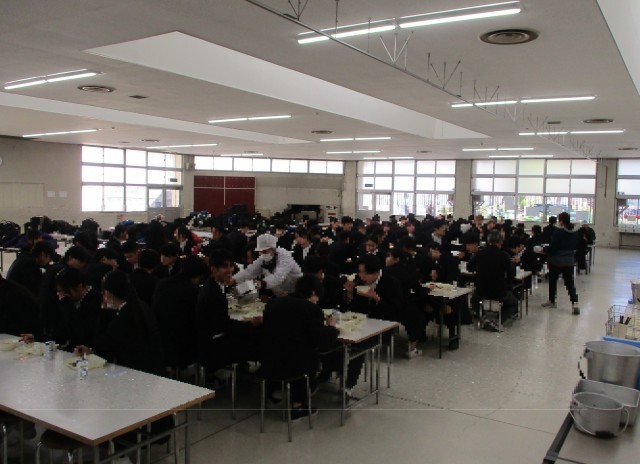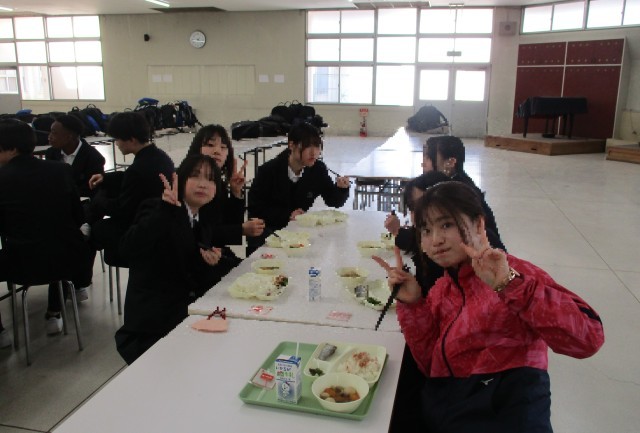 3年生は、最後の給食となるのでランチルームにて学年そろっての給食となりました。
