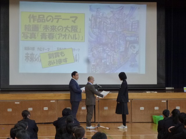 表彰伝達は、中学生絵画・写真コンクールの絵画部門「未来の大阪」で入賞した作品の紹介です。