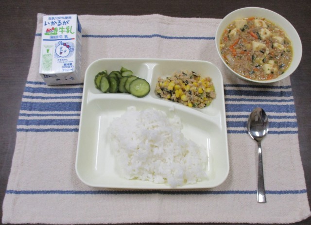 今日の献立は、ごはん・牛乳・マーボーどうふ・きゅうりの中華あえ・ツナとチンゲンサイのいためものです。