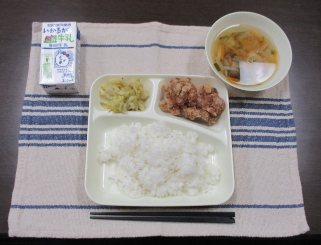 今日の献立は、ごはん・牛乳・鶏肉のたつたあげ・五目汁・キャベツの梅風味です。