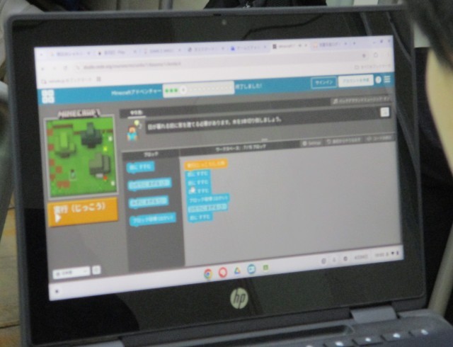 プログラミングについて、教育用の「マインクラフト」を使って学んでいます。