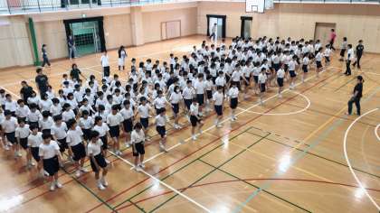 学年ごとに声出しの練習をした後、全学年合わせて行進をしました。
