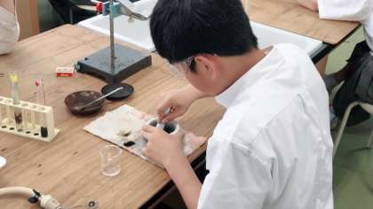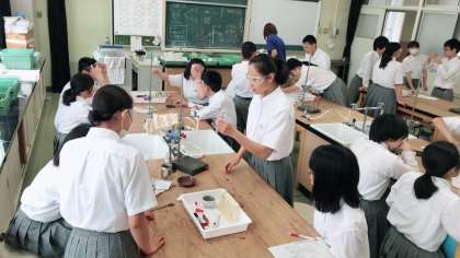 理科の実験で硫化水素を発生させています。実験で使用する器具や装置などが本格的になってきましたね。