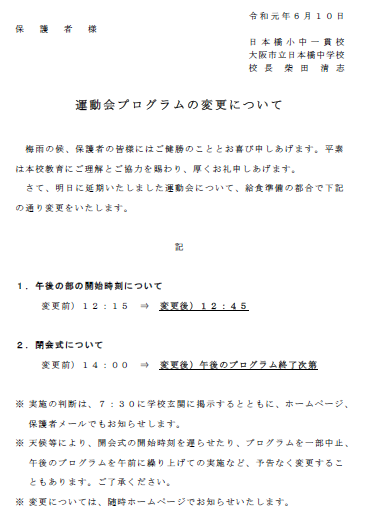 明日の中学校運動会について、下記のプリントを生徒に配付しています。