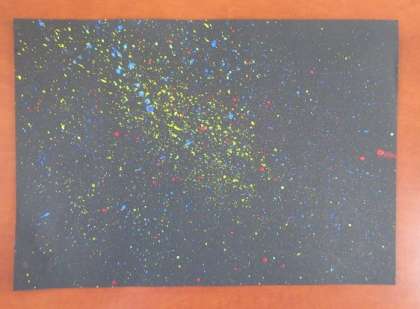 「スプラッタリング」は絵の具を飛び散らせる技法です。絵筆を持っている方の手を、もう一方の手でたたいて、絵の具を飛び散らせました。