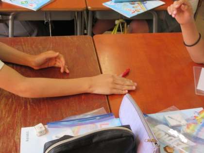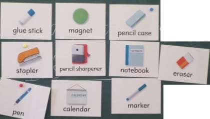 今日は、鉛筆、消しゴム、定規などの単語のキーワードを教師が決め、その言葉が出たら、ペアで、目の前に置いたペンや消しゴムをとる「キーワードゲーム」をしました。