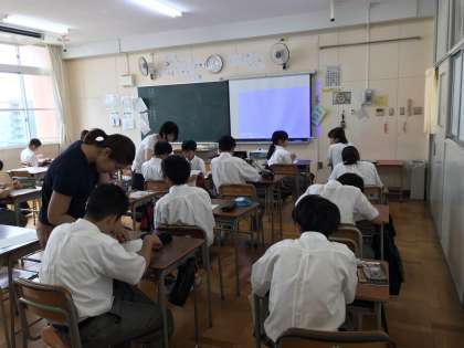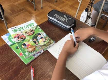 家庭科の授業で、「学校給食献立コンクール」に出す献立を考えています。テーマは自分でねらいを持って栄養素のそろった献立を考えられるようになること。近くの人と相談しながらも、それぞれが一生懸命考えていました。