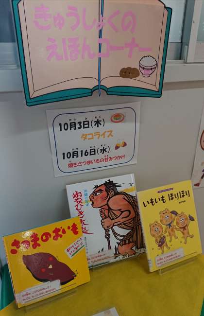図書館補助員の方が、給食の献立に関連する絵本を展示してくださっています。